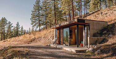 In the small mountain town of Mazama, a new cabin sits bermed into a steep slope, offering dramatic views of the Methow Valley and mountain bike and cross-country ski access for the outdoor enthusiast owner.