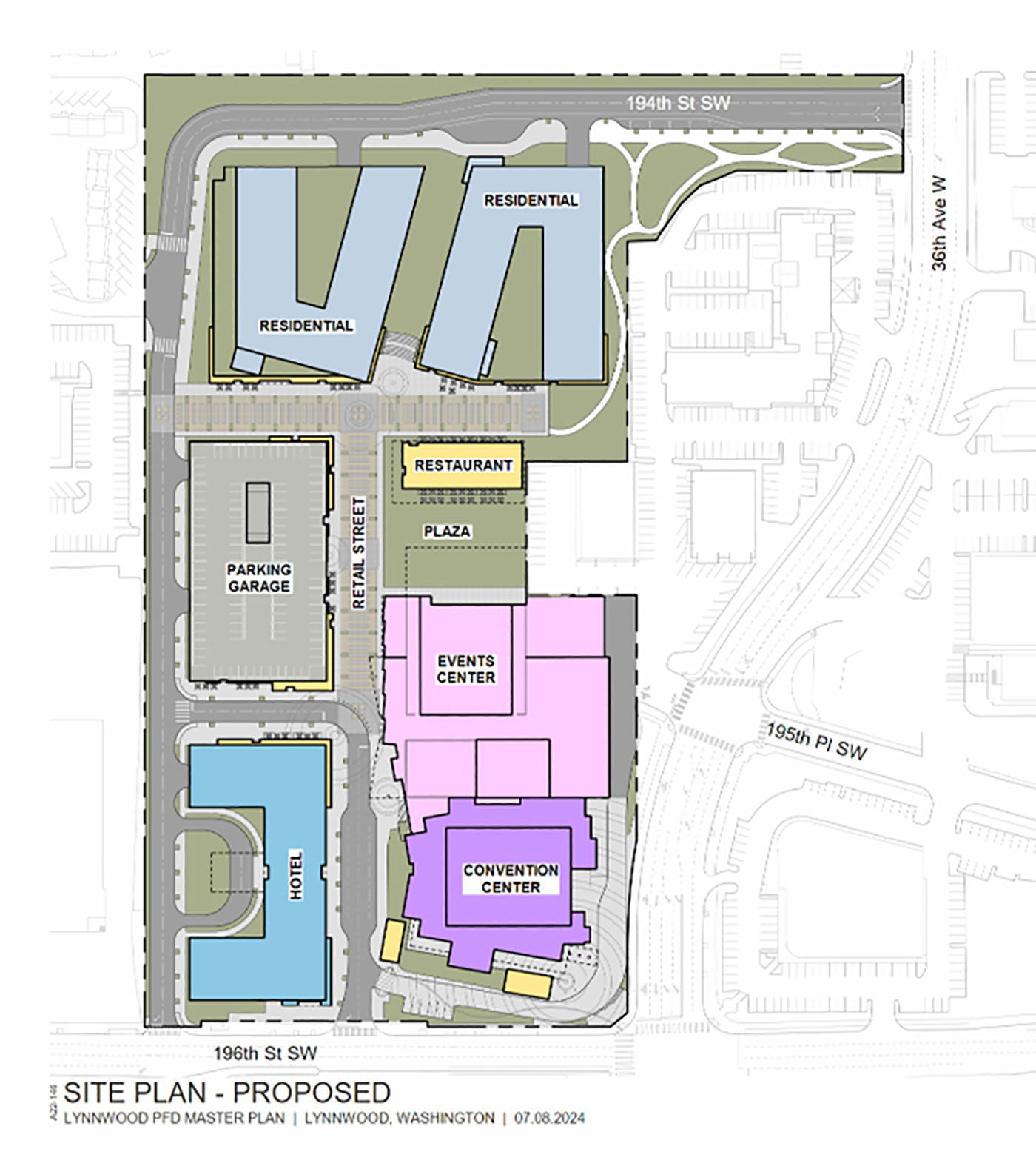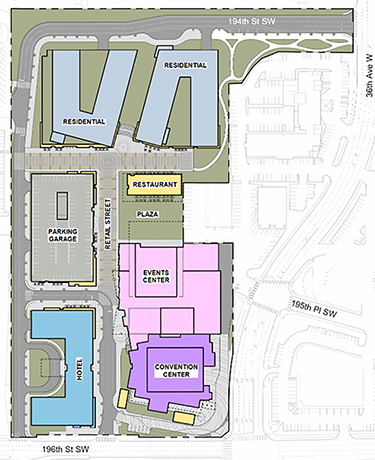 The District master plan revisions the blocks it owns surrounding the 20-year-old Lynnwood Event Center and the four-building Alderwood Village Shopping Center strip mall (with lots of asphalt parking) as a walkable entertainment, cultural and retail district. Public spaces planned include a central lawn, a woonerf street and outdoor plazas with space for public programming as well as casual use.