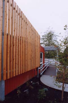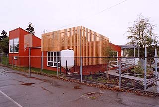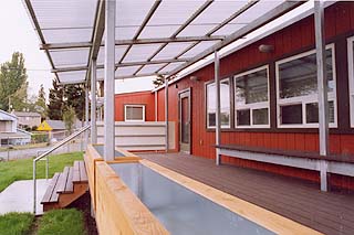 Environmental Works Community Design Center Dave Sarti, project designer Jan Gleason. principal in charge Owner Seattle School District Project type Child care center Size 2,490 square feet Completion August 2003 Construction cost $329,000 Structural engineer Swenson Say Faget Electrical engineer AES Inc. Mechanical engineer Sider & Byers Associates Landscape, civil engineer Bob Foley & Associates General contractor Steelecorp “There is a simple sense of love in the inexpensive details of what has obviously become a comfortable space for children.” “This project demonstrates how the neutral fabric of a prefabricated house can be enhanced by small, low-cost additions and innovative finishes. The result is dynamic and exciting.” “By limiting the pallet of materials used in additions to the exterior, a playful sense of assembly is communicated.” “This project demonstrates the transformative power of design ideas on a temporary classroom building.” |