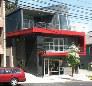 166 Roy jazzes up the walk along Roy Street on Lower Queen Anne. With the addition of one floor, the renovated building brings mixed-use back to the address.