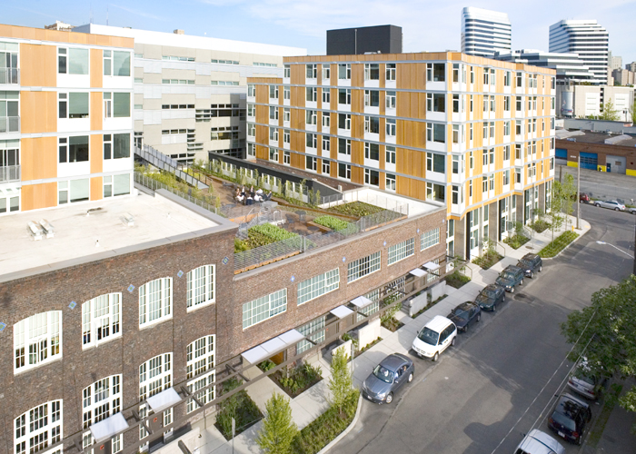 Alley 24, its new corporate home, delivers. But it is a restrained partner in a larger complex also designed by NBBJ and owned by Vulcan Real Estate and Pemco.