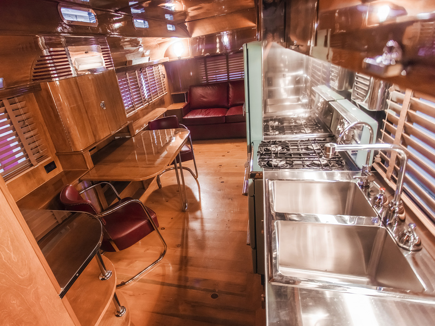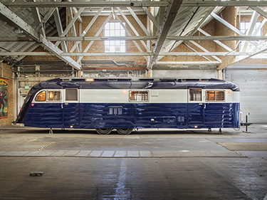 Lackner, industry expert Steven Butcher and a team of craftspeople in California resto-modded the 33-foot-long trailer in an art deco style. It has a Pullman roof with seven windows on each side, allowing for 6 feet, 4 inches of head room. The remodel included modern features (video and audio systems) hidden within cabinets and behind period switch plates. Custom-made curtains add to the classic look. Crews also added new hearing and air-conditioning systems.