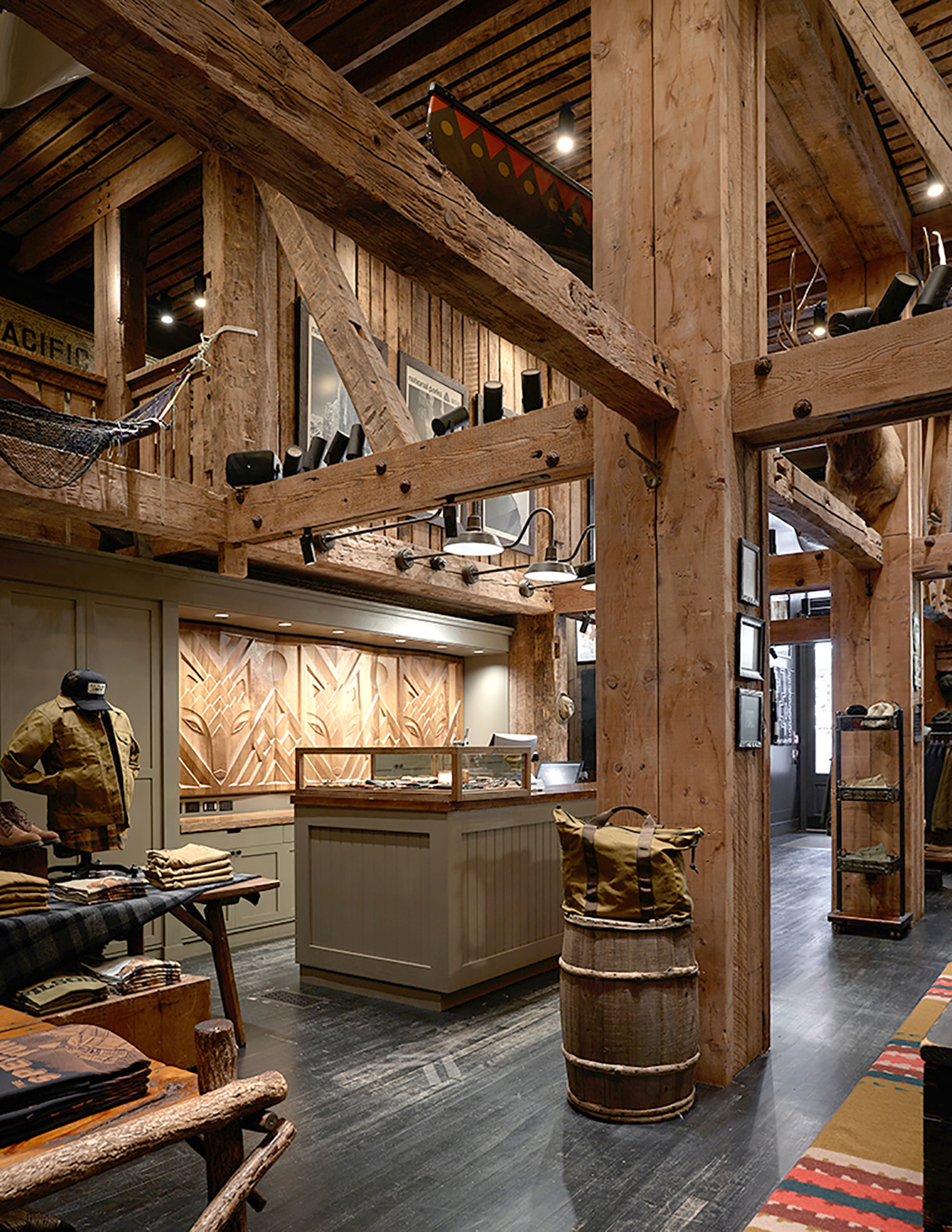 Heliotrope said that inside this “barn” the team built custom, solid fir and painted wood display cabinets to showcase the men's product lines, and mounted to the post-and-beam salvaged wood structure above, a gallery of artifacts, hunting decoys, canoe shells, logging equipment, vintage images and maps that evoke the qualities of a Darius Kinsey photograph.