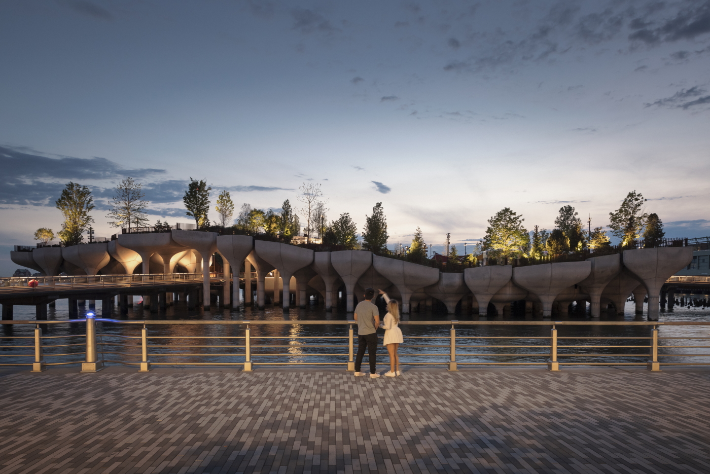The park rests on concrete pots set on pilings of different heights, so that paths wind through the 2.4-acre space at a gentle, rolling grade.