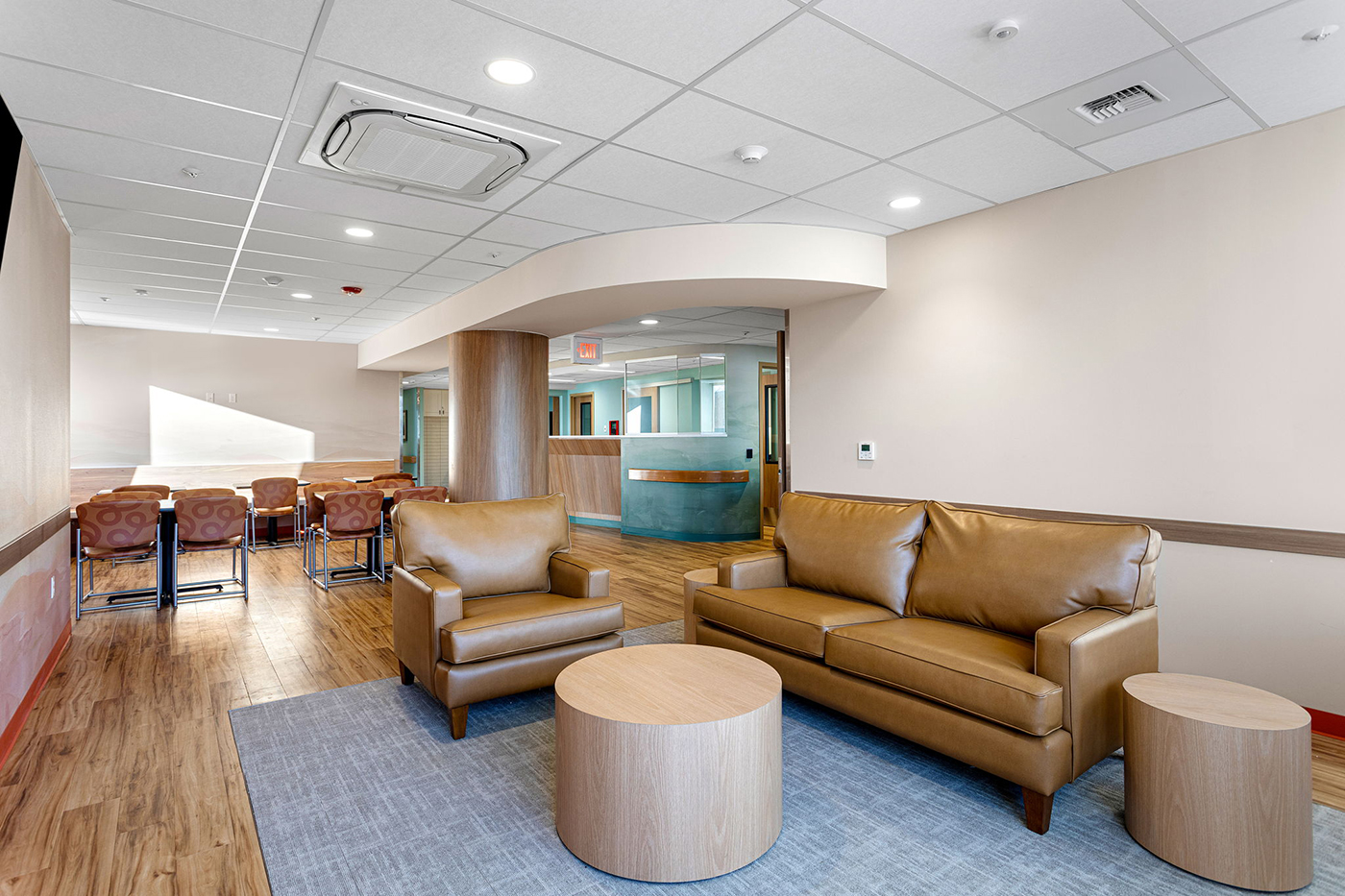 The new 7,000 square foot facility is on the ground level of the former office building. Patient rooms are a mix of private and shared spaces split across two neighborhoods. There is also a dining and social space and a nurse station.