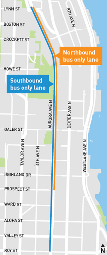 SEATTLE — Starting as soon as this month the city will be converting the right-most northbound lane on Aurora Avenue North between South Lake Union and the Aurora Bridge into a bus-only lane.