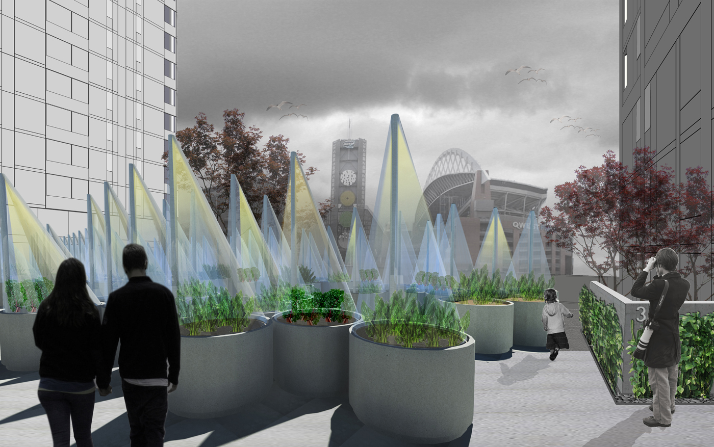 For the farm on the 15,000-square-foot podium, Jones devised a system of 150 planters, or miniature greenhouses, made of concrete culverts 5 feet in diameter and 4 feet tall. A small cistern at the base will be topped by soil. The culverts will be exposed during in the warmer months, and can be converted into greenhouses with the insertion of a steel pole in the planter. A translucent sheet of plastic would hang from the pole and wrap around the edges of the culvert, creating a half teepee-like cover. A fluorescent bulb attached to the pole will provide heat and light.