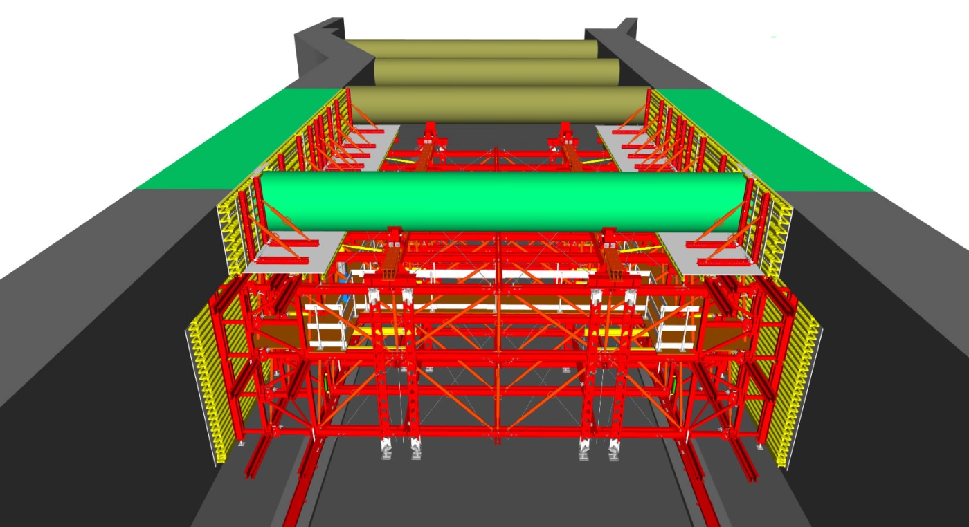 At the end of each pour, the steel truss system collapses about two or three feet from the walls of the station — just enough to move to the next location.