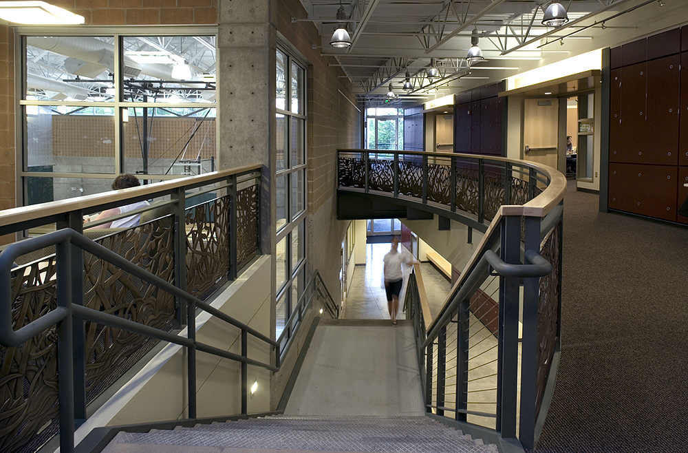 The exterior is covered with brick veneer, colored concrete block and cast-in-place concrete and metal siding.