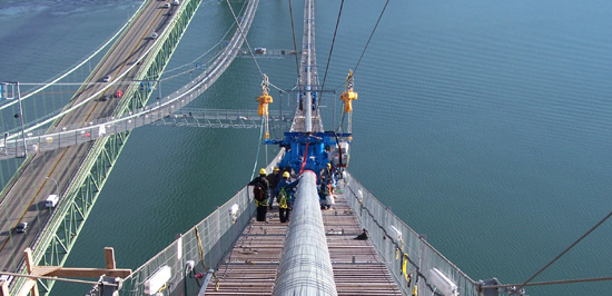 The bridge’s main cable suspension system, consisting of two 20.5-inch-diameter cables, was assembled from 18,000 miles of steel wire.