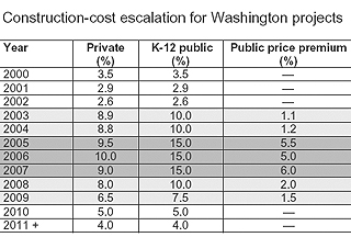 The table on this page sets out escalation for public versus private projects in the state of Washington. Looking ahead, it’s anticipated that the current premium imposed on public projects will continue throughout 2008, after which it’s expected to align itself with private work.