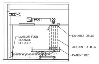 The goal is to provide temperature conditioning only in the occupied volume of the room, not the upper empty reaches, and carry contaminants directly out of the occupied zone without mixing them into the room air. The system is not only more comfortable for occupants, but effectively protects both staff and patients from germs. Economies are significant. Displacement ventilation requires only four air changes per hour, a reduction of one third over traditional methods. Less air at a higher temperature translates into less energy required to chill and deliver the air. Engineers estimate that total energy ventilation cost reductions can be as high as 30 percent.