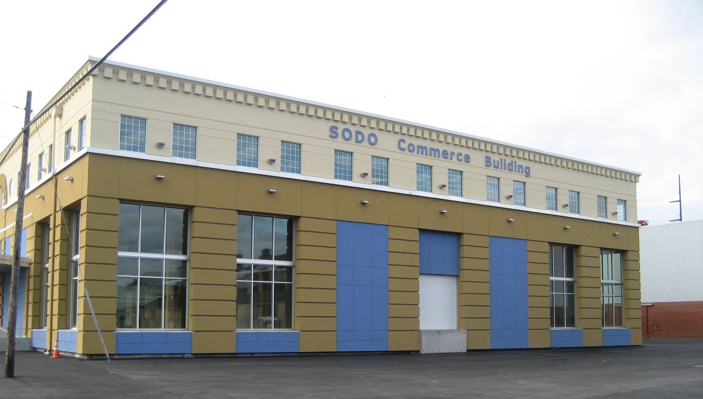 Crews made and installed additional custom steel plates to reinforce deteriorated wood beams inside the building. Mehrer Drywall then erected the light-gauge-steel stud and plywood-framed shear walls. The work was finished with a dryvit system applied to the exterior by JJ Jefferson Co. The building, now named Sodo Commerce Building, is available for lease and is suitable for both office and light-industrial uses.