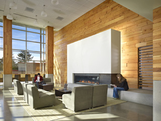 Olympia Avenue’s main lounge and first-floor classrooms reinforce this interplay between campus buildings and nature. Large sliding doors open directly onto an outdoor plaza while a large fireplace provides an inviting space during cold months. Framed by wood paneling reclaimed from nearby abandoned barns, the fireplace reflects the area’s agrarian character.