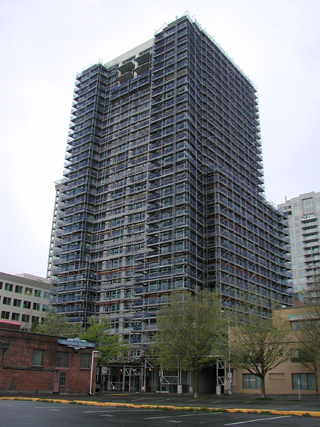 Urback said crews from Lease Crutcher Lewis and its demolition subcontractor, LVI Services of New York City, will start with the garage, a six-story structure next to the 25-story apartment tower. The garage has five townhouses above the parking.