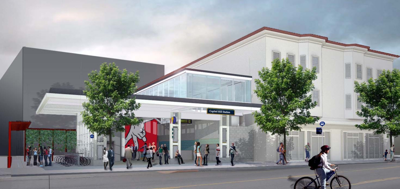 Seattle-based Hewitt designed the station. It will have three entrances: on the east side of Broadway at East John Street; at the corner of East Denny Way and Nagle Place; and on the west side of Broadway just off Denny, which is shown here.