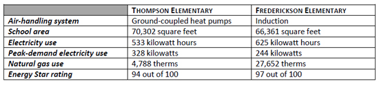 Thompson Elementary, which uses ground-coupled heat pumps, and Fredrickson Elementary, which uses the induction system, are both relatively large two-story schools. Both were complete and fully occupied during the 12-month period the utility information was compiled between December 2009 and November 2010.
