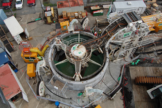 The shaft is kept full of water during excavation to help balance groundwater levels and to allow the excavated material to be pumped out and sent through separation equipment for disposal. The machine is capable of excavating and lining 3 to 15 feet a day.