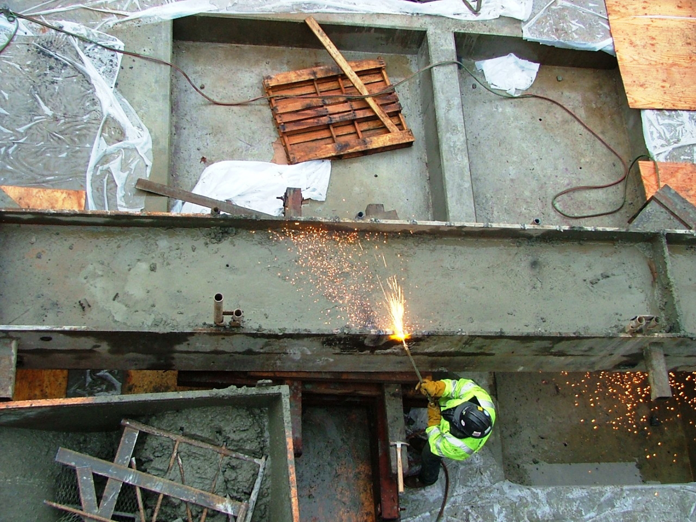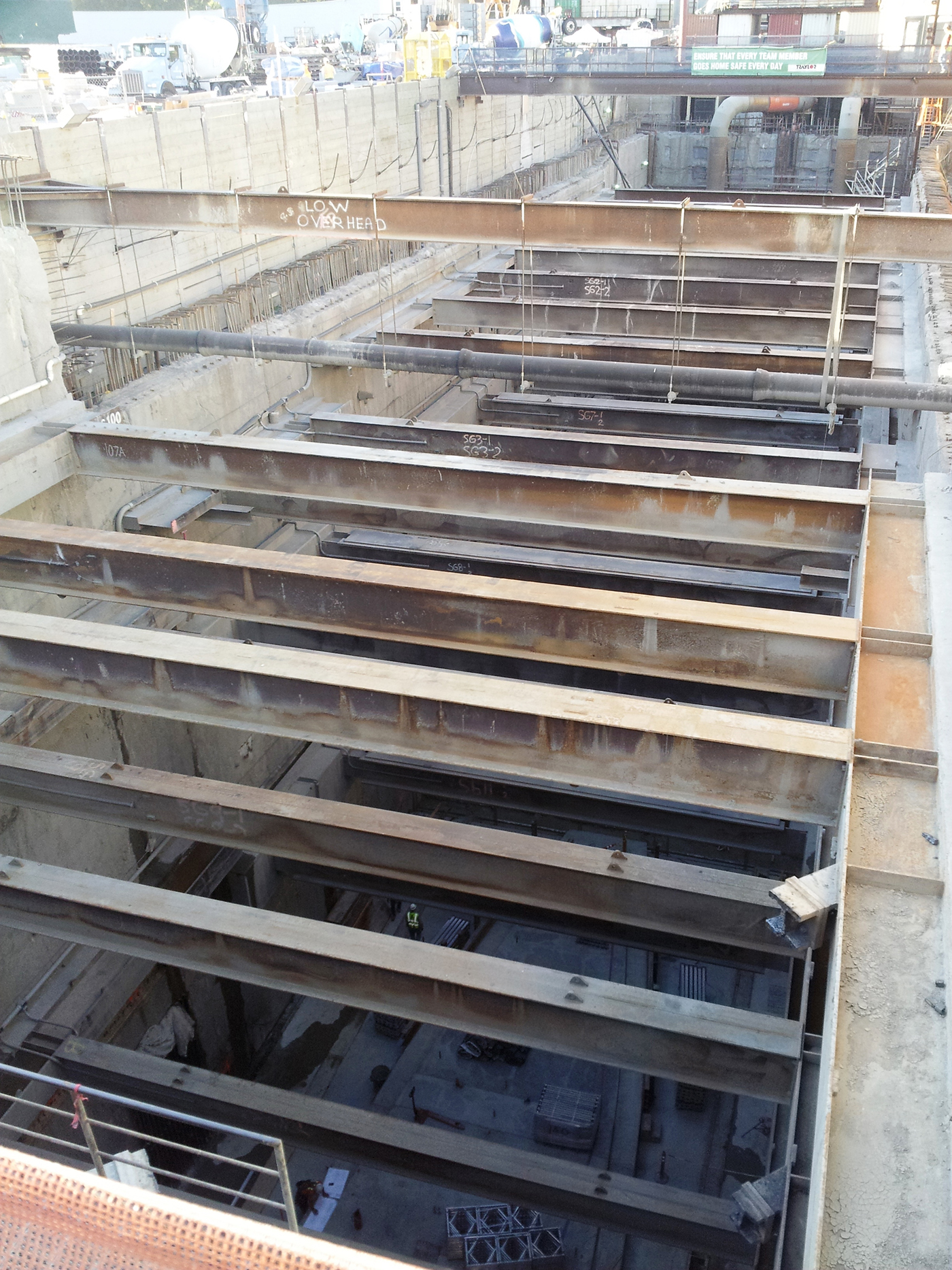 The massive steel bracing beams stretched across the excavation to brace the perimeter walls and connected to even larger steel beams running along the face of the walls, creating the temporary support framework. The size and weight of the beams, coupled with the newly installed permanent construction, required the beams to be torch cut into much smaller segments prior to hoisting them to the surface.