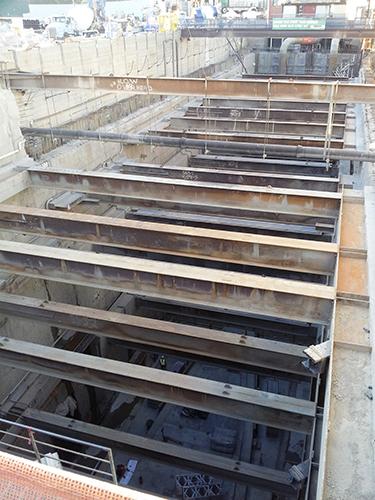 The excavation of the “station box” or pit is 800 feet long, 65 feet wide and nearly 120 deep. To retain the perimeter soil, concrete slurry walls were installed from the top down as the excavation progressed. To allow the launch of the tunnel boring machine, the excavation was divided into two sections, with the tunneling side completed first and the station side next. To create the two sections, a 4-foot-thick transverse wall was installed across the excavation. As the excavation progressed, and the concrete slurry walls were installed to create the box, massive steel beams were installed to temporarily brace the perimeter walls until the station’s final structural members could be put in place.
