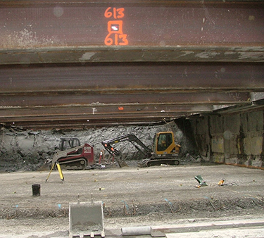 The final piece of the puzzle was the removal of the perimeter bracing steel, or whalers. To ensure full contact of the massive steel whalers to the perimeter walls, crews grouted the spaces between the whalers and the wall surface. This grout, 3 feet thick and embedded with large steel supports in many places, could not be accessed and removed with conventional concrete breaking equipment.