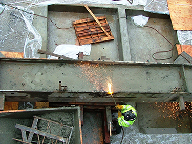 Working off of the new structural slabs, NCM crews installed supports along the length of each beam and cut the beams to manageable lengths. As the crane hook was not able to be positioned above the steel, the smaller pieces were rigged and hauled to central locations that the crane could access. Following this process, more than 1,500 tons of steel was supported, cut, moved and hoisted out.