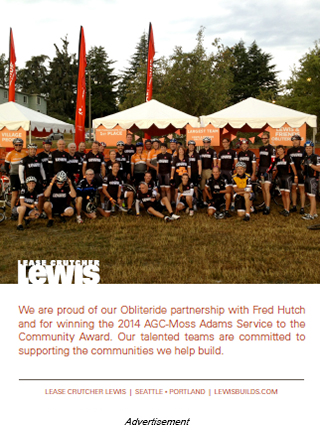 From the start, the Lewis team decided to go big. In early 2013, Lewis leaders were approached by Fred Hutch to support their idea to hold a bike-ride fundraiser to help “obliterate cancer,” and immediately signed on and committed $40,000 to be the volunteer program sponsor. Lewis also helped promote the event through blogs, jobsite signage and construction-community contacts.