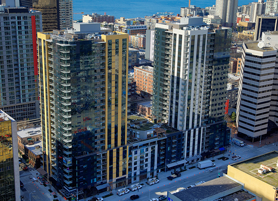 Lewis completed Seattle’s largest-ever single-phase apartment project on time and under budget. The Via6 complex has two 24-story towers,18,000 square feet of street-level retail and below-grade parking for 434 vehicles.