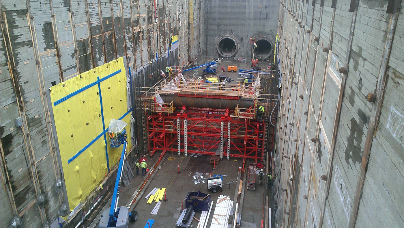 The system allowed Turner to travel the entire length of the station box, pouring concrete in complete areas. The design team believed eight pours would be required per section to get from the ground level to the roof. The traveler system enabled the team to reduce the total number of pours from 216 to 108, with the truss system spanning the station interior and pouring walls on both sides simultaneously.