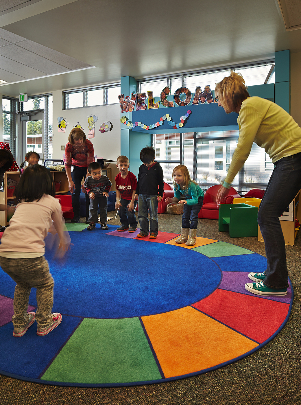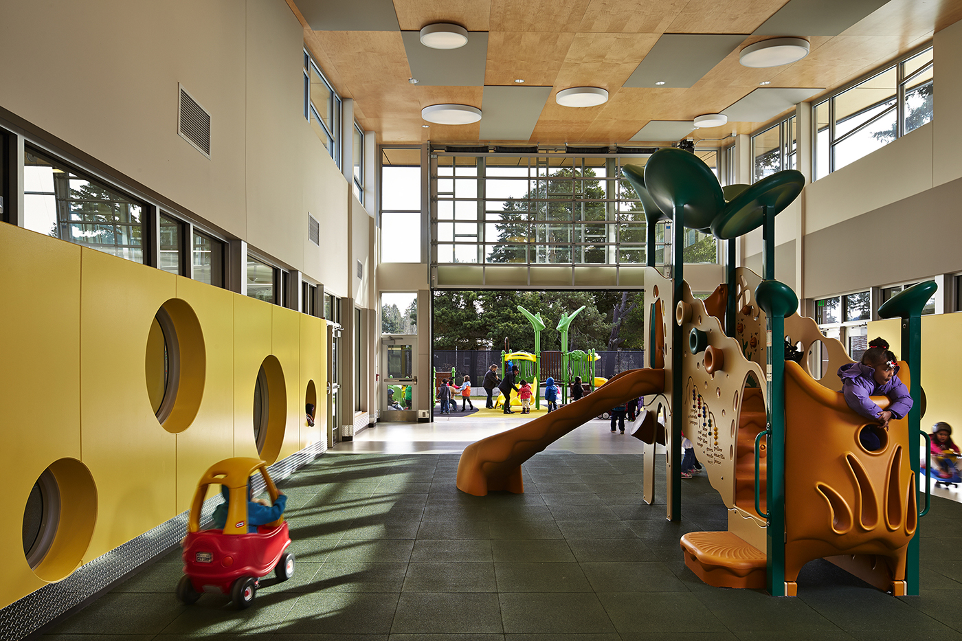 Shared indoor play courts between the classroom wings are accessible from each classroom. Floor-to-ceiling windows fill play areas with natural light and allow children to experience the outdoors on even the rainiest of Pacific Northwest days.