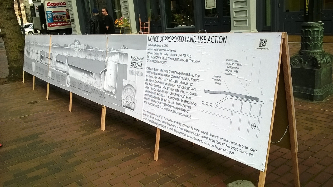 The “Notice of Proposed Land Use Action” sign appeared yesterday mounted on a 20-foot board next to The London Plane restaurant. It says “the citizens of Seattle are conducting a feasibility review” about a project called Born Again Bertha.
