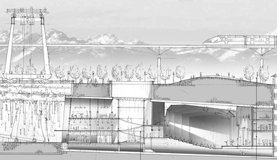 The middle school would be inside the tunnel, which would also house the theater, sports center, and a skate park that starts at the surface and enters the tunnel via an “accelerator chute.”