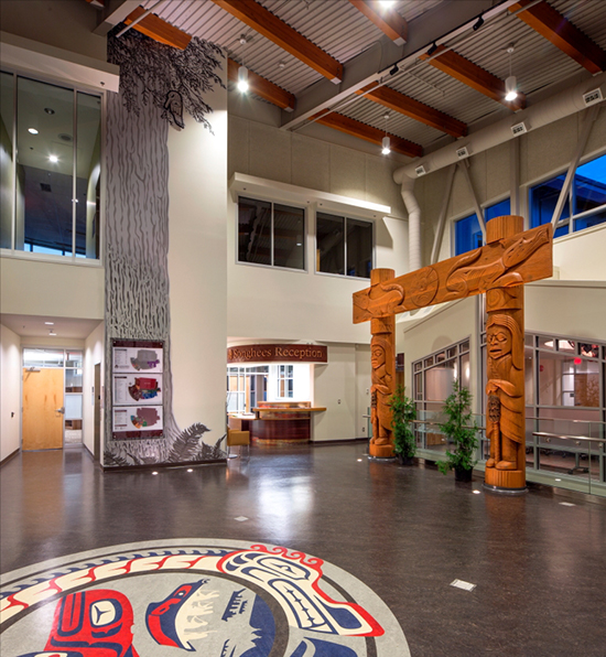 The Songhees Wellness Centre in Victoria serves as a mixed-use facility for the Songhees First Nation. The three-story, concrete-and-steel building has been designated LEED silver and includes a 300-person gymnasium, industrial kitchen, administrative offices, boardrooms, and a health center focusing on physical, mental, emotional and spiritual health. It also serves as a post-disaster gathering place for the band.