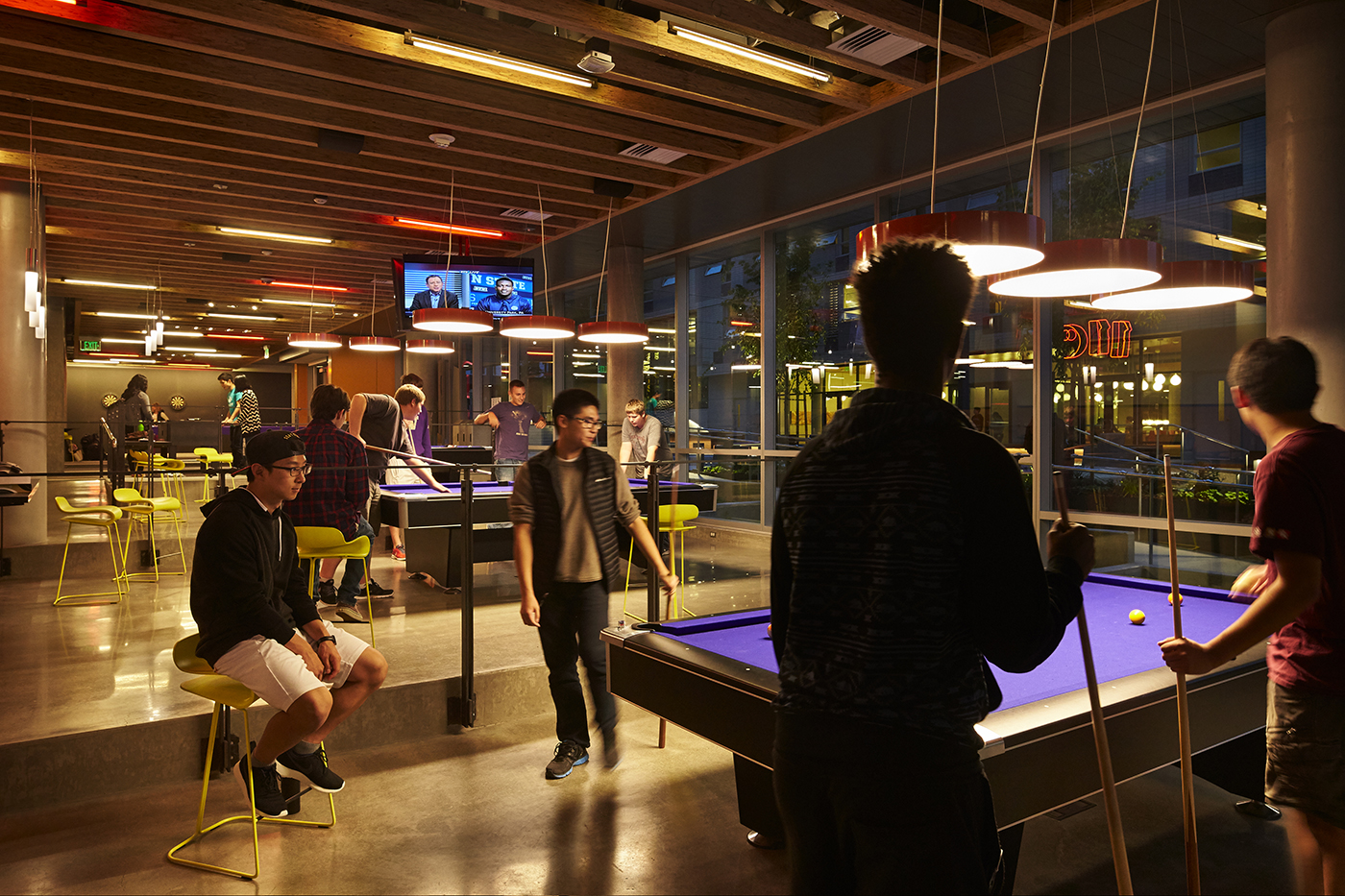 The dining facility for the area’s nearly 6,000 students is located at the heart of West Campus in Lander Hall, where students are encouraged to learn about healthy food. Lined with glass walls to inspire student engagement, an innovative chef’s table with theater-style seating accommodates classes in nutrition and cooking, and doubles as a space for relaxed dining or meeting friends. This mixing of spaces is another trend among universities, maximizing their available square footage while providing amenities that students love.