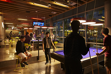 Building community is the primary goal of these LEED gold buildings, as freshmen begin to live on their own in this transformational time. Spaces are created for friends to get together and play music in the “music lab,” cook a meal in the group kitchen, celebrate birthdays, or play billiards and pingpong in the game center.