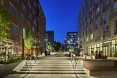 Blending indoor spaces with the outdoors, the sidewalks and plazas also offer a series of communal spaces for students to recreate, study, relax, collaborate and dine. These areas become the social mixing areas for students through a series of walkable plazas and street-fronts that further blend the campus into its unique student-focused urban neighborhood.