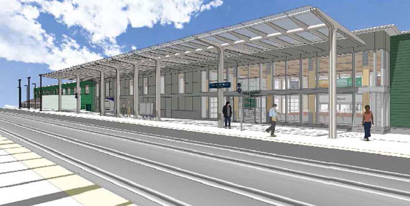 WSDOT wants to demolish the middle section of Freighthouse Square — next to the Sounder heavy rail station — and build the new station there. The new space will connect to Freighthouse Square and has been designed to complement the exterior, with wood siding and metal panel cladding. A passenger platform with canopies would be built next to the rails.