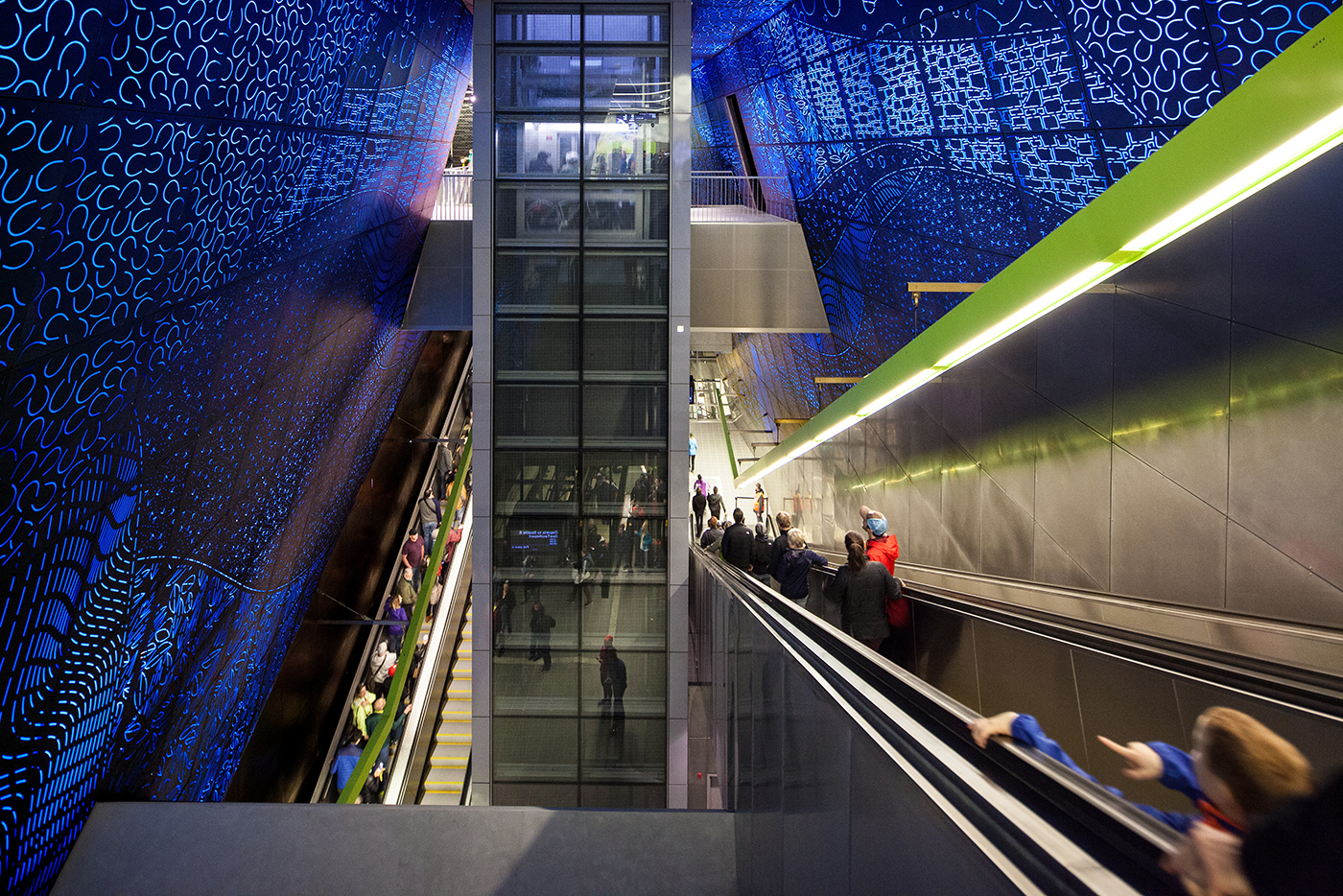 At the heart of the station experience, the escalators and glass elevator pass through a 55-foot-high central chamber, one of the tallest interior volumes in the city.