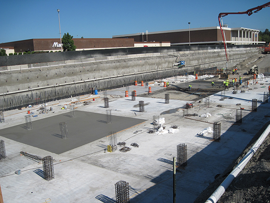 Some of the major challenges for the project included the constrained site, permanent structural support system, concrete shrinkage and leakage control, and settlements and differential settlements during and after construction.