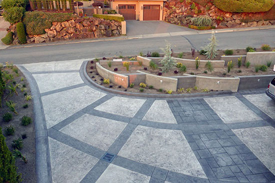 The concrete driveway was designed to look like real stone, though it cost only about half as much. Its colors included slate gray with a medium gray release, and a natural gray with a light gray release.