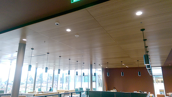 The second ceiling system, above the student dining area, required 1,800 square feet of Geometrik wood-grille ceiling and Armstrong acoustical ceiling grid. The installation, design and construction teams worked together to achieve the exacting detail needed at the penetration and slat lines.