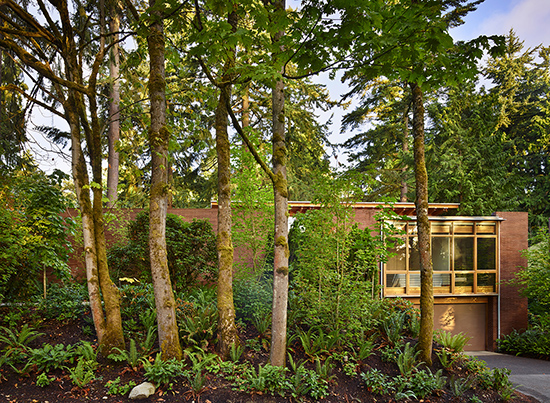 This suburban 3,850-square-foot brick, steel and wood residence is located in a quiet neighborhood surrounded by homes from the 1950s and 1960s. The lot was home to seven magnificent Douglas fir trees, and the entire design of the home was created with a connection to the outside.