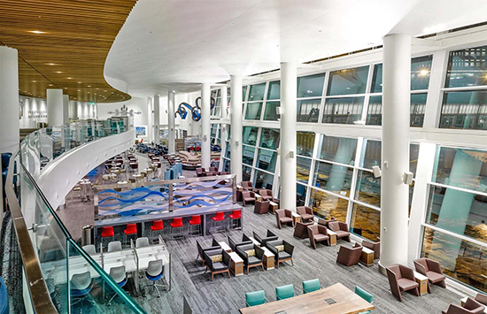 Delta Sky Club is part of an expansion on Concourse B at Sea-Tac Airport. The 23,400-square-foot project is one of the largest Delta Airlines clubs in the world. The club features a commercial kitchen with food service, bar, restrooms, spa and seating for more than 400 people.
