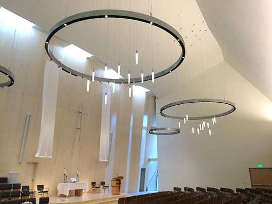 The sanctuary has a steep sloped drywall ceiling at a 5/12 and 18/12 pitch with five large skylights along the north wall for lots of natural light. The sanctuary ceiling also has six fold points to undulate the ceiling. Cross-laminated timber panels fit into a recessed slot in the ceiling. KHS&S worked with the engineer and Armstrong to design a drywall grid system to match the slope of the ceilings.