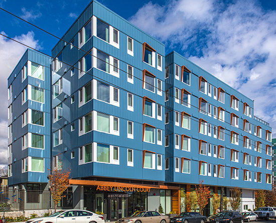 Abbey Lincoln Court is a six-story, 70-unit workforce housing project in Seattle’s Central District.