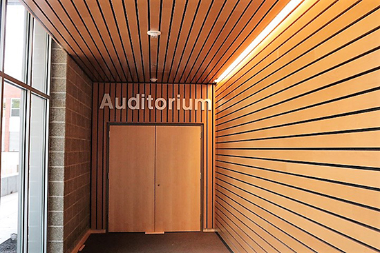 In the arts center, linear wood ceilings and walls required painstaking detailing to match edges and reveals. The large practice rooms required complex acoustical diffusers in the ceilings and on the walls. Smaller private rooms were built with two ceilings (one drywall and one acoustical), special framing and soundproof doors.