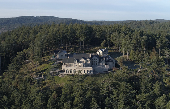 The Eagle’s Nest estate in the San Juan Islands occupies 21 acres with seven structures totaling 23,000 square feet with Spanish slate roofs in an Old-World European style.