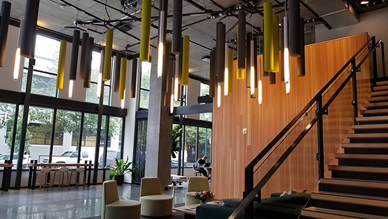 The high-rise had four different specialty ceiling types: suspended felt baffles, aluminum egg-crate ceiling panels, USG Pixels wall and ceiling panels and surface-mounted horizontal sound panels.