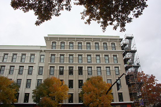 The building is unique in using a traditional stucco system with an immense amount of details and shapes. The two elevations adjacent to the street of the 40,000- square-foot facade are adorned with a series of cornices, arches, pilasters, and corbels while the interior courtyard elevations are finished in smooth stucco.