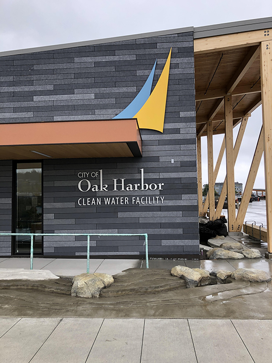 The Oak Harbor Clean Water Facility design is inviting and texturally pleasing to the eye. Features include dark brick, a light gray tile pattern adjacent wall, and light wood accents.
